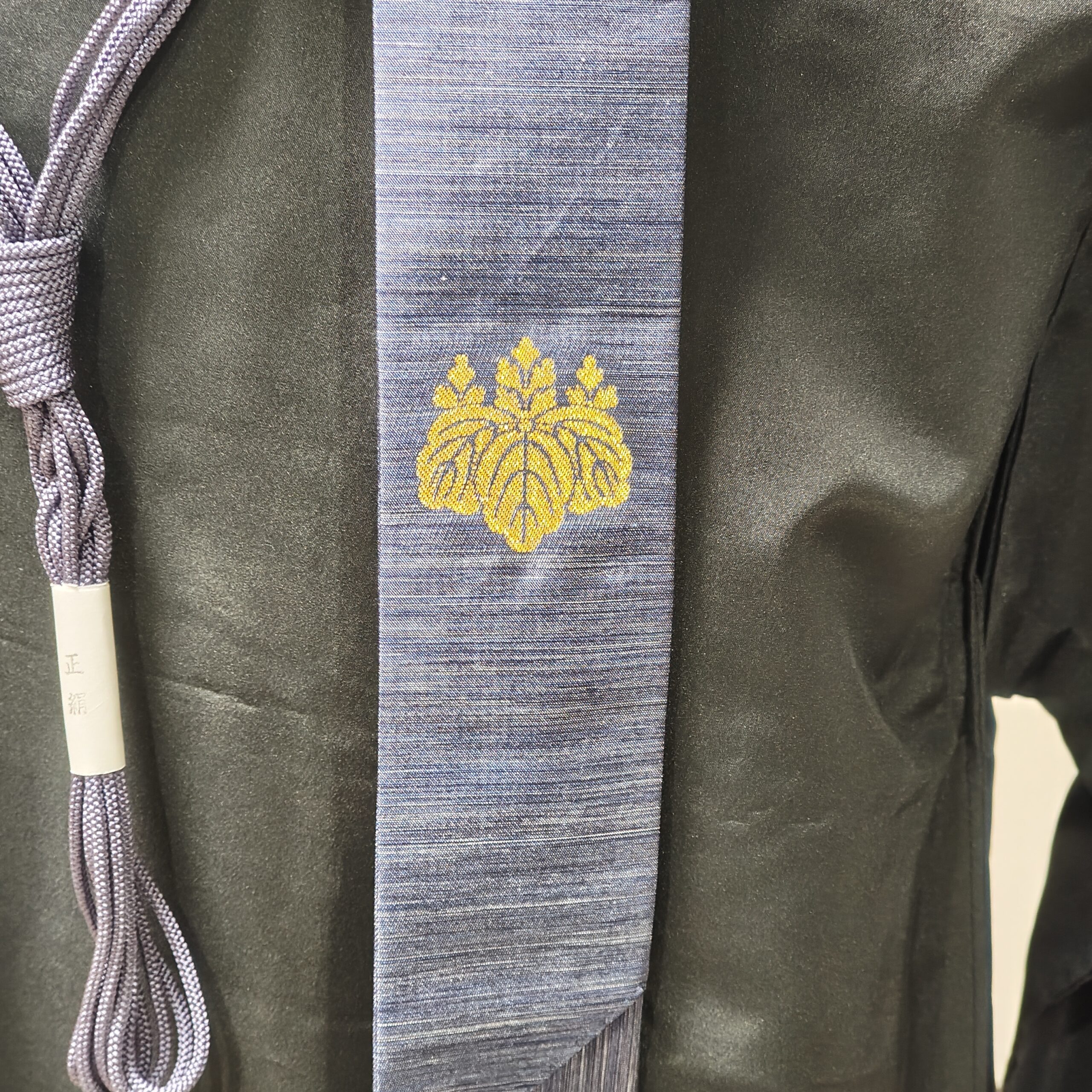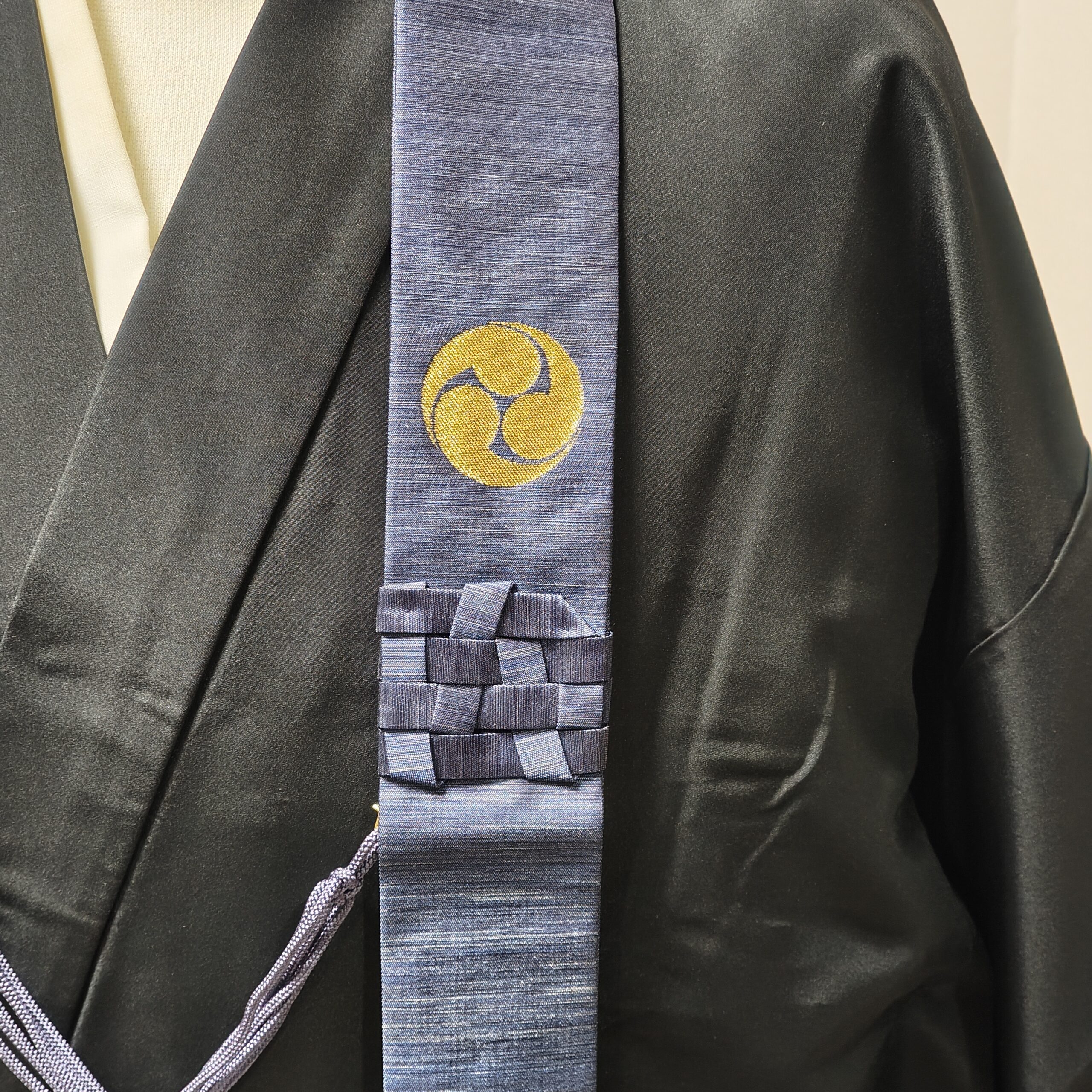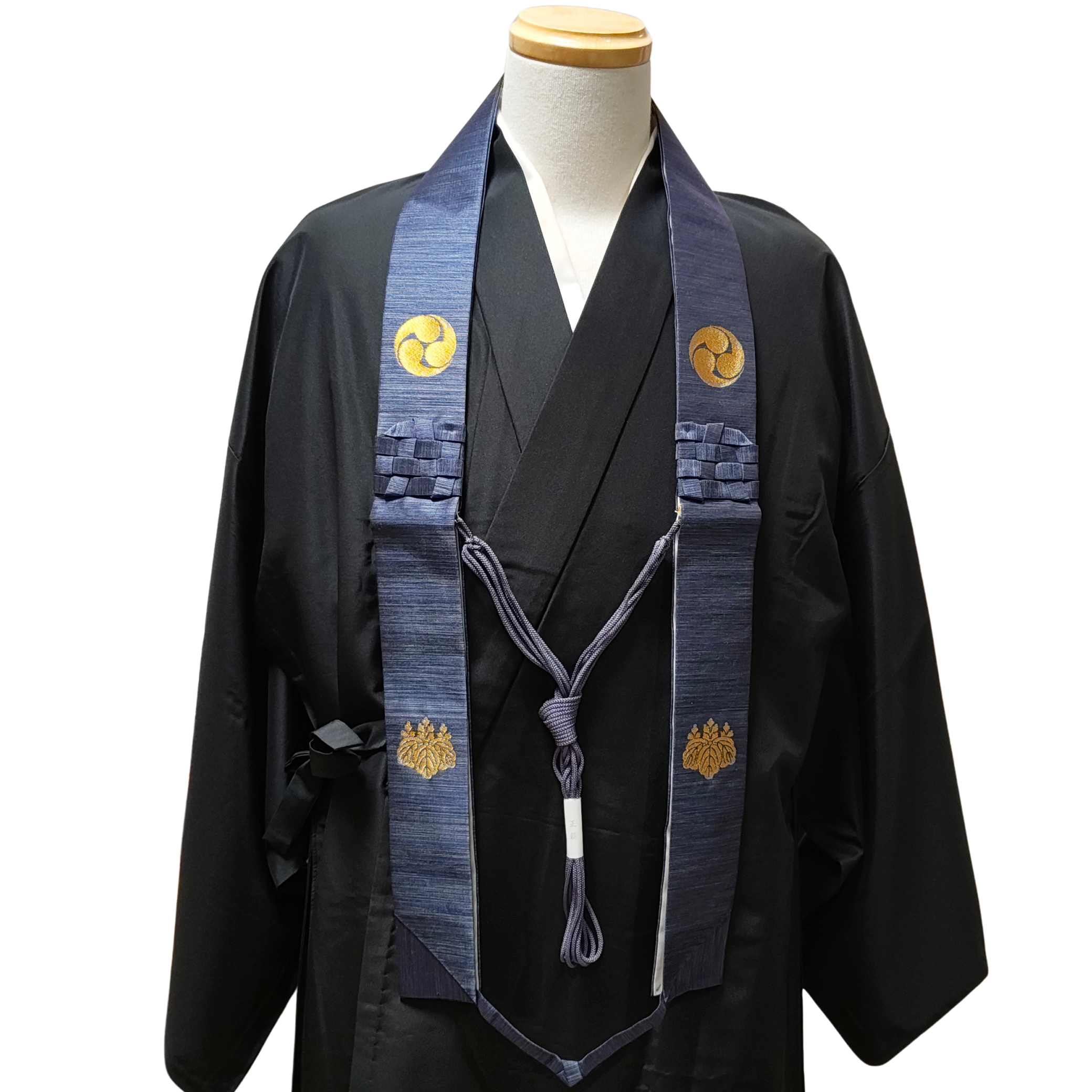 深みのある紺色の枯淡地に、高野山真言宗の宗紋「桐巴(きりともえ)」の金紋が鮮やかに映える一領です。